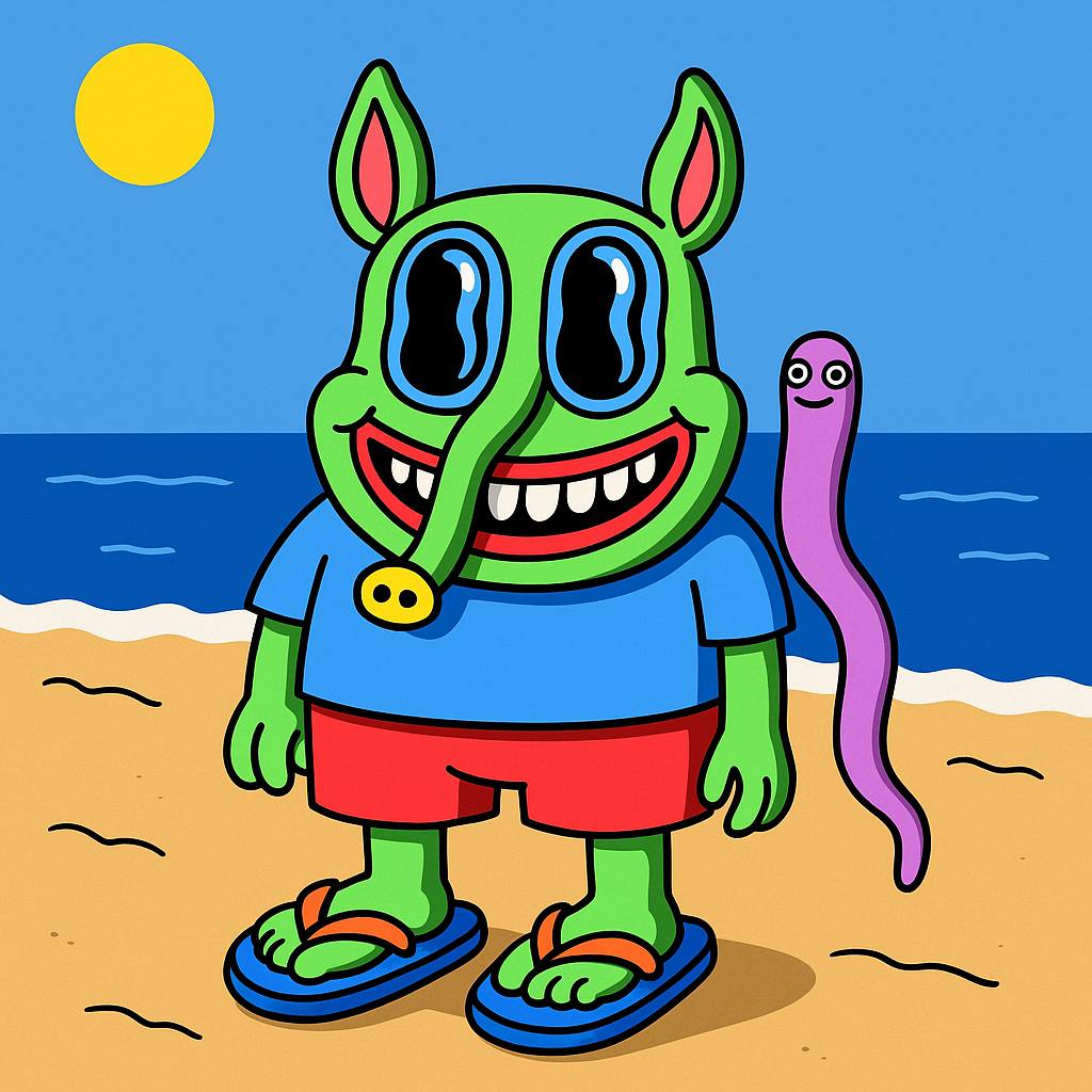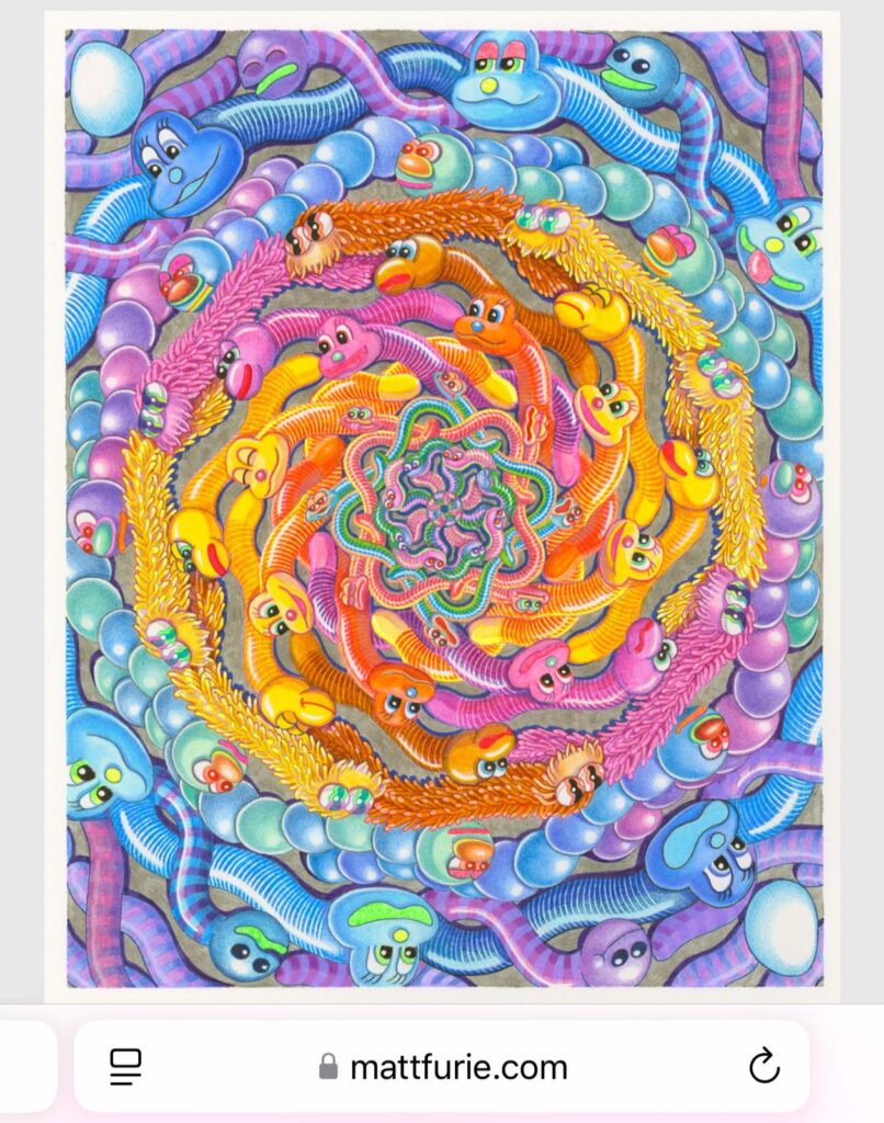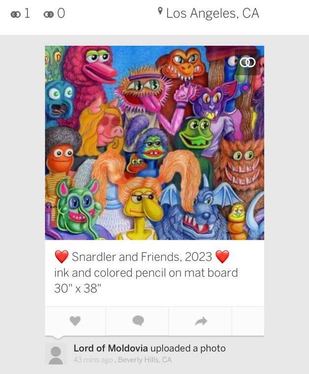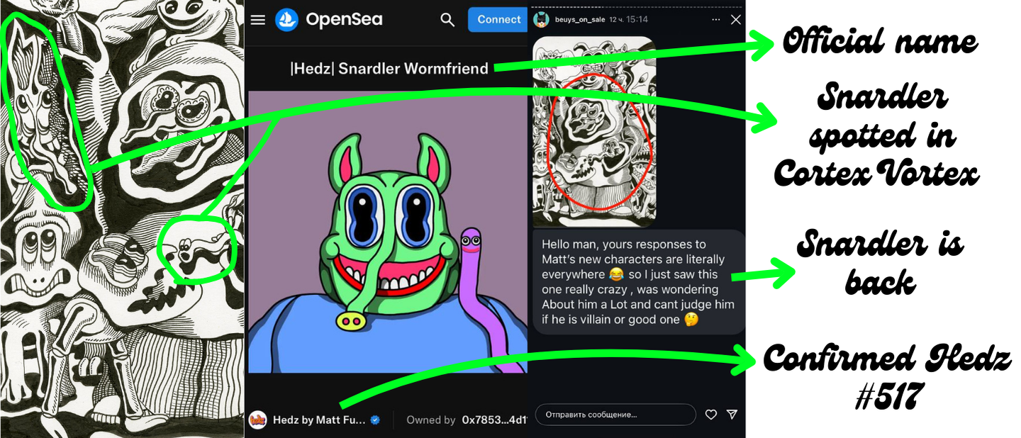 Snardler isn’t just a meme, he’s real. Listed as “Snardler Wormfriend” in Hedz by Matt Furie (#517 on OpenSea), and now featured in Matt’s upcoming book Cortex Vortex, teased by the editor on Instagram @beuys_on_sale.